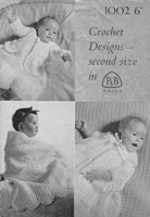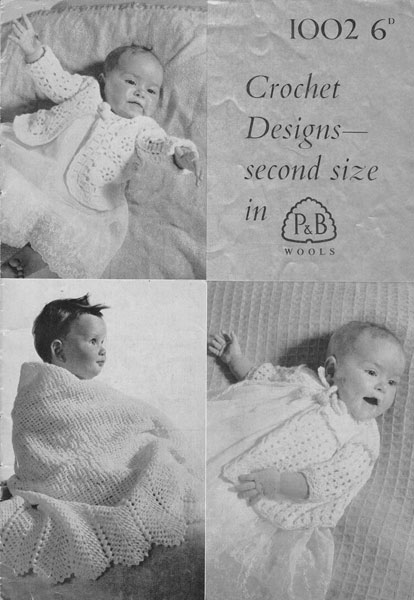 *Patons 1002cr : Great little silver pattern for baby crochet patterns 1950s. This little pattern was very popular throughour the late 1950s and 1960s. There are two little jackets and pretty shawl. One jacket is worked in vintage 2ply, so try modern3ply and the other one is in quickerknit, so try either double knitting or 4ply and change hooke to get the size. the shawl is worked in vintage 2ply and will bou about 54 inches square depending on yarn and tension. Nice little pattern book in good condition. original pattern as shown £2.00