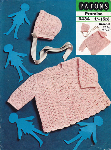 *Patons 6434cr: Great vintage baby crochet pattern for jacket and bonnet 1969. This little coat is so pretty and has a little bonnet to match. Worked in 4ply yarn, but always work a tension square and change hook if needed. To fit 20 inch chest. There are crochet instructions for stitches on back page. Pattern in good condition. original pattern as shown £2.00 colour All images and text on this website are copyright fab40s.co.uk and are for reference and historical interest only You can email sue@fab40s.co.uk |