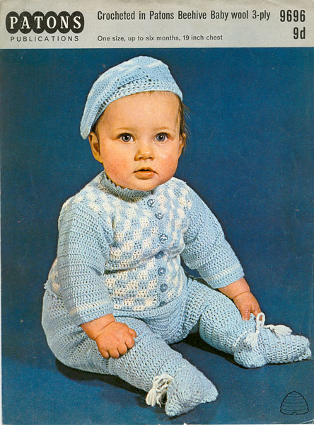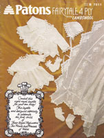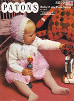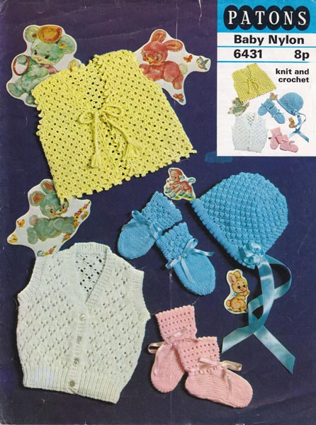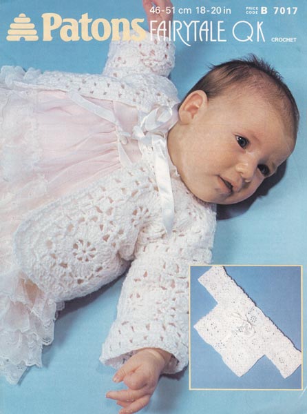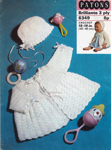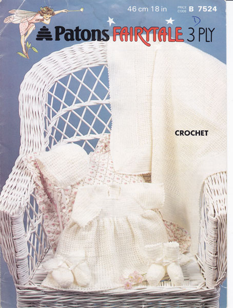 Patons 7524cr:Very simple to work, yet pretty baby crochet layette, including a shawl. All worked in 3ply, work a tension square to see if you need to change hook size to suit modern yarns. 1984 There instuctions for dress 19" (48cm), bootees, bonnet, mittens and shawl (47"x47") 120cm square. Probably easy to adapt another pattern for a jacket to be included. Pattern in good condition, with slight mark to top edge inside.. original pattern as shown £2.00 colour All images and text on this website are copyright fab40s.co.uk and are for reference and historical interest only You can email sue@fab40s.co.uk