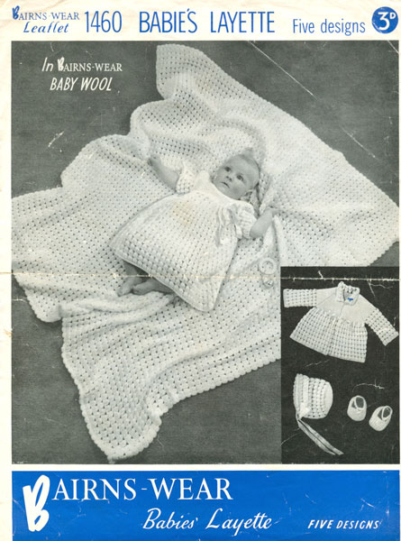 Bairnswear 1460:Vintage CROCHET pattern for babies layette, with simple, but effective lattice pattern. There is a shawl, dress, jacket, shoes and bonnet, all worked in vintage 3ply for chest 19" so try tension square and change hook size if needed.
