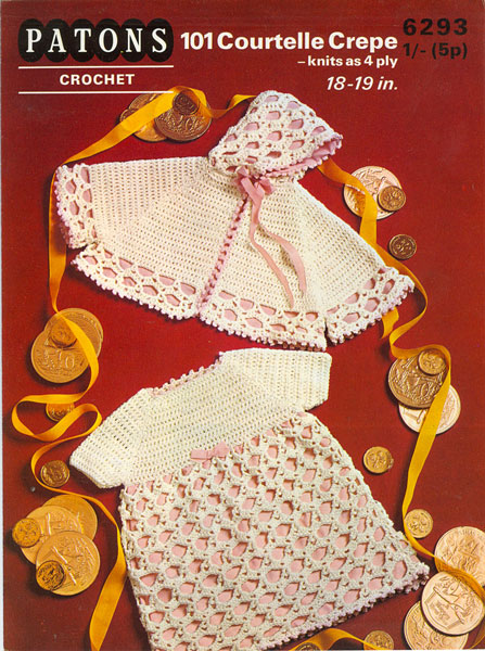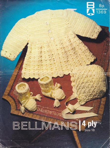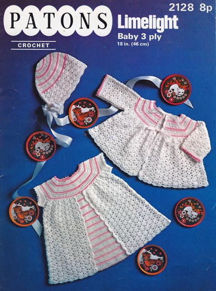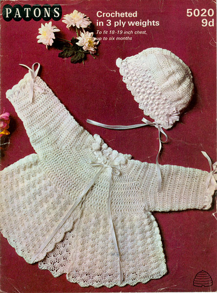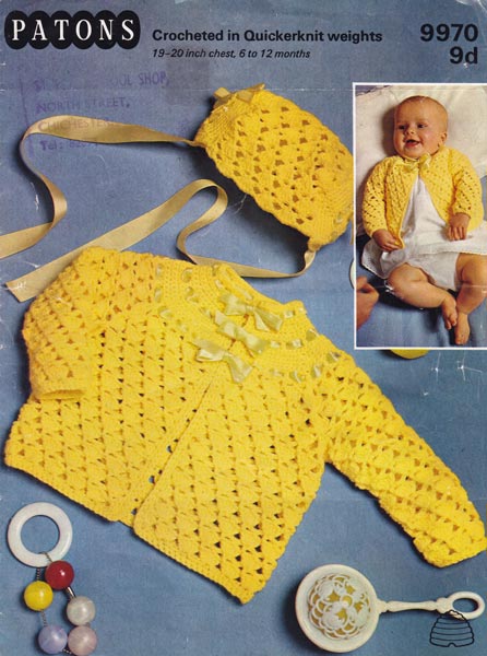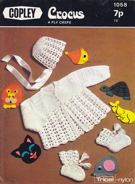 Copley 1058: Another pretty vintage crochet matinee set, bonnet, jacket and bootees from 1972, 19 inch chest. Work tension square to see if you need to change hook for modern 4ply. Pattern is in good condition. original pattern as shown £2.00 colour All images and text on this website are copyright fab40s.co.uk and are for reference and historical interest only You can email sue@fab40s.co.uk