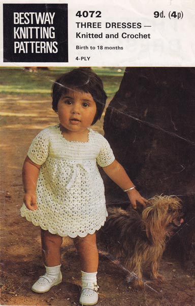 Bestway 4072: Pretty vintage crochet dress pattern from 1969. To fit birth to 18 months. There are also two knitted dresses in this pattern - one with a fair isle border. Worked in vintage 4ply so try a tension square first and see if you need to work it in double knitting to get the correct size or just change hook or needle size. Pattern in nice condition with few minor creasings, clean and sound. original pattern as shown £2.00 colour All images and text on this website are copyright fab40s.co.uk and are for reference and historical interest only You can email sue@fab40s.co.uk |