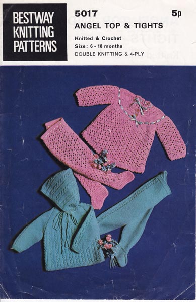 Bestway 5017: Pretty vintage crochet and knitting pattern for angel top and tights and hooded jacket and leggings. 1970. To fit 6-18 months worked in double knitting and 4ply. 19-20 inch chest. Pattern has a few surface marks and minor creasing as can be seen in the picture, but is sound and clean. original pattern as shown £2.00 colour All images and text on this website are copyright fab40s.co.uk and are for reference and historical interest only You can email sue@fab40s.co.uk |