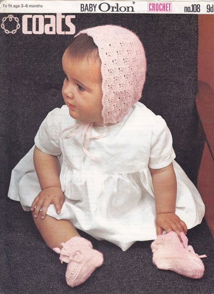Coats 108: Great vintage crochet pattern fro pretty bonnet and bootees from 1960's, worked in vintage baby 3ply, which is similar to modern 4ply, to fit age 3-6 months for a smaller size work in modern 3ply and a smaller hook. Pattern is in great condition.