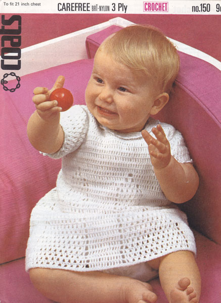 Great vintage crochet pattern for baby dress from 1960's, to fit 21" chest , worked in vintage 3ply, so try a tension square with modern 4ply and see if you need to change hook to get correct size, use modern 3ply for a smaller size and a larger hook for a slightly larger size. Pattern is in excellent condition.