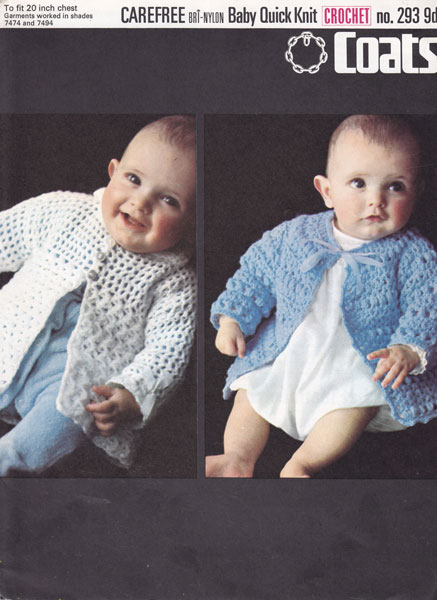 Coats 293: Great little vintage matinee coat crochet pattern, from 1960's, two different designs to fit 20" chest worked in baby quick knit, as this is no longer available try modern 4ply on a large hook, for a smaller size use modern 3ply and for a slightly larger size use modern double knitting with larger hook. Pattern is in great condition. original pattern as shown £2.00 colour All images and text on this website are copyright fab40s.co.uk and are for reference and historical interest only You can email sue@fab40s.co.uk