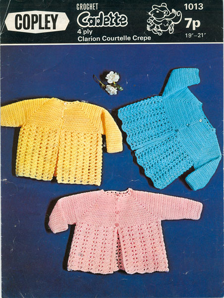Copley 1013: Pretty vintage CROCHET pattern from 1970 for 19"-21" chest, 3 different designs in 4ply. Try tension first to see if you need to change hook size with modern yarn. colour All images and text on this website are copyright fab40s.co.uk and are for reference and historical interest only You can email sue@fab40s.co.uk |
