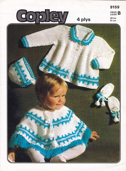 Copley 9159: Great vintage crochet pattern for poncho, jacket, bonnet and mittens to fit 20" baby in 4ply 1978. Dont for get to work a tension square and change hook if needed. pattern in great condition. origianal pattern as shown £2.00 colour All images and text on this website are copyright fab40s.co.uk and are for reference and historical interest only You can email sue@fab40s.co.uk |