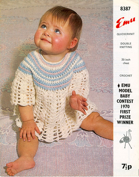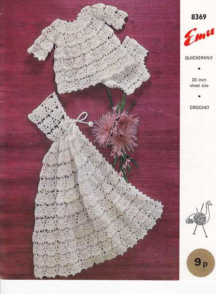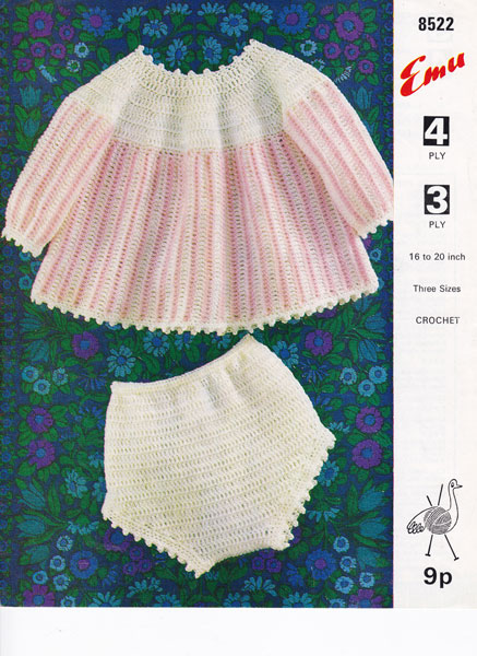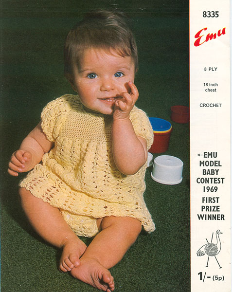 Emu 8335: Vintage crochet pattern for a lovely little dress and knickers in vintage 3ply to fit 18" chest. 1969 Try modern 4ply for this size or modern 3ply for a smaller size. colour All images and text on this website are copyright fab40s.co.uk and are for reference and historical interest only You can email sue@fab40s.co.uk |