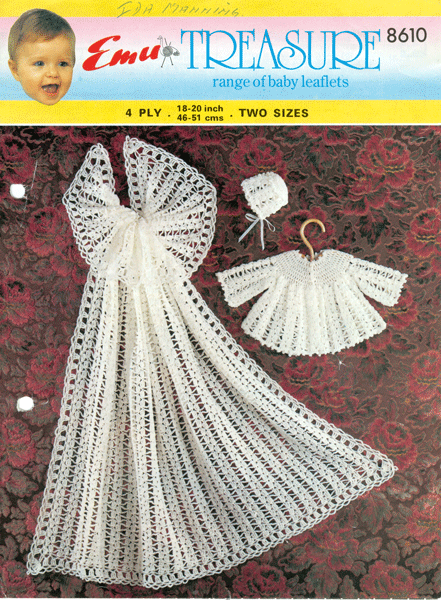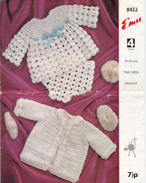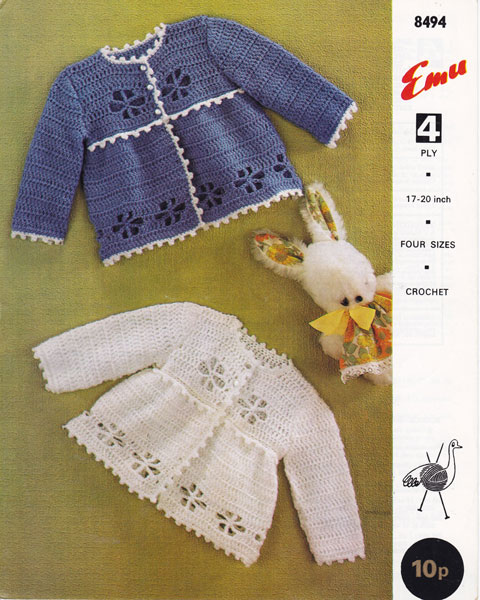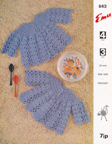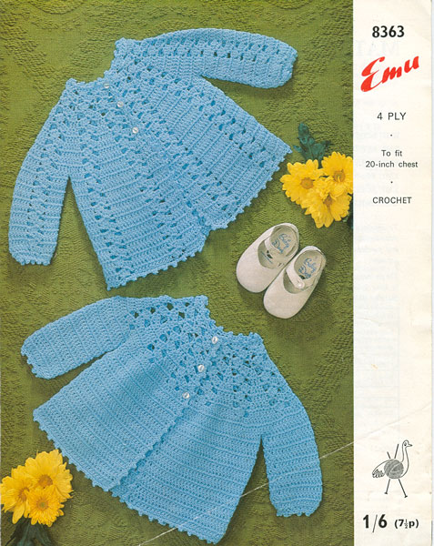 Emu 8363: Two pretty crochet matinee coats in vintage 4ply to fit chest 20 inches work tension square to see if different size hook is needed or if double knitting might work better, depending on the size you need. 1970 Pattern colour All images and text on this website are copyright fab40s.co.uk and are for reference and historical interest only You can email sue@fab40s.co.uk |