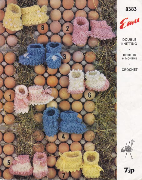 Emu 8383: Fabulous 1970's vintage crochet pattern for 8 different bootees in double knitting for birth to 6 months, use 4ply for tiny prem or newborn. Very cute. original as shown £2.00 colour All images and text on this website are copyright fab40s.co.uk and are for reference and historical interest only You can email sue@fab40s.co.uk |