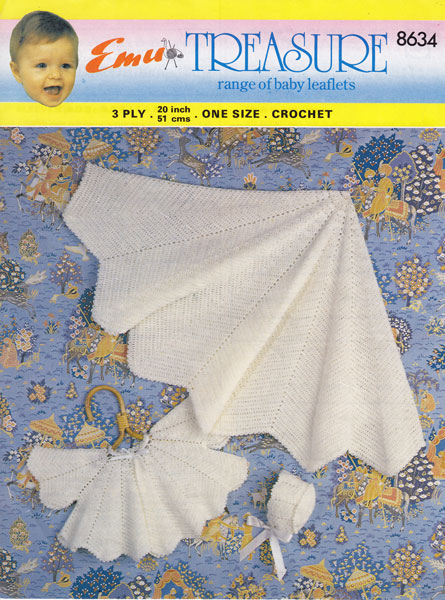 Emu 8610: vintage shawl pattern in CROCHET, 50" square in 4ply wool, matinee and bonnet in same pattern. Matinee 18 and 20 inch chest. FOR MORE SHAWLS SEE SHAWLS, COVERS AND BLANKETS PAGE colour All images and text on this website are copyright fab40s.co.uk and are for reference and historical interest only You can email sue@fab40s.co.uk