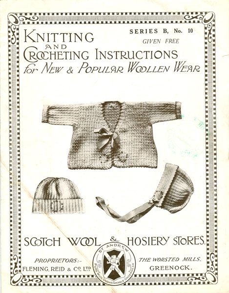 Greenock 10: lovely vintage crochet pattern from the 1920's for bonnet, hat and simple matinee to fit 24" chest worked in vintage 3ply, so substitute modern 4ply and work tension sample to see if you need to change size of hook. Use modern 3ply and a smaller hook for smaller size. Original pattern has crease to front but is sound and clean. orignal pattern £4.50