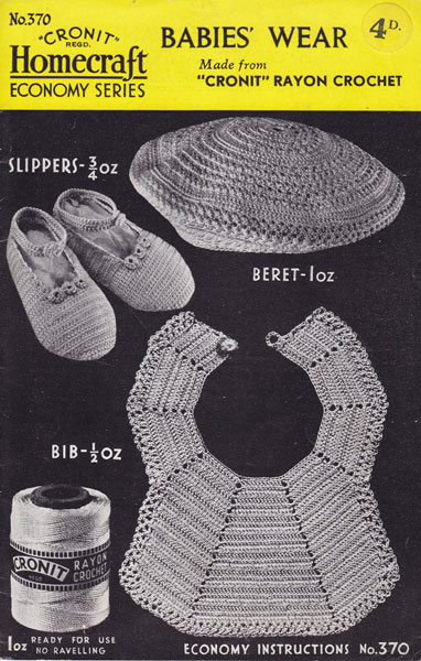 Homecraft 370: Fabulous vintage baby crochet pattern 1940s. This pattern has instructions for bib, shoes and beret, fabulous to go with a Christening outfit, boy or girl - all easy to work. This was a wartime pattern, so economy was the key, each item takes 1oz or less that is less than 30g of cotton, if you can get a silky look one (or even real silk) it will look even better. Try no20 in a tension square - tension is 11 trebles to one inch.