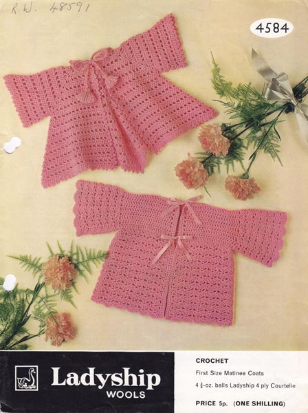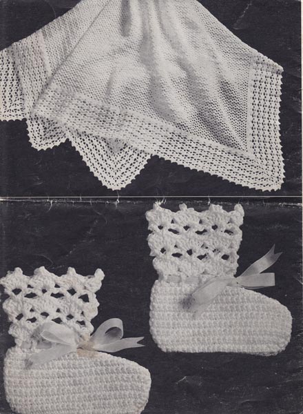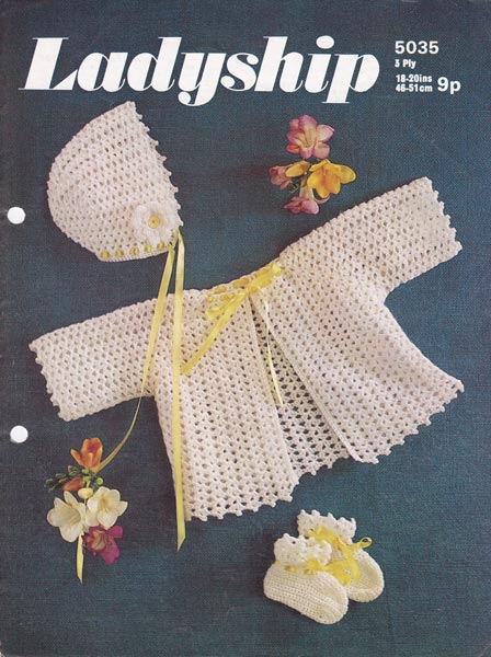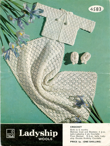 Ladyship 4583: Lovely vintage crochet pattern with instructions for a sweet little matinee jacket and bootees in 4ply plus a pram blanket in double knitting, blanket measures 19" x 30". 1972