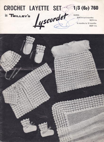 Lyscordet 760: vintage 1969 crochet pattern for layette with shell edging. Birth-6 months 18" chest and 6-12 months 20" instructions for dress, jacket, bonnet, bootees, mitts and shawl. Nice easy pattern great for beginners who want a little bit of a challenge. Knitted in cotton, probably 40 count but try tension square to see if 20 will work as this is more readily available - it is worked on quite a fine hook 13 and 11 imperial so probably similar to 3ply yarn would have been used. Pattern has a crease across the front and some pen marks on the front also, one small mark on final page. original pattern £1.75 All images and text on this website are copyright fab40s.co.uk and are for reference and historical interest only You can email sue@fab40s.co.uk