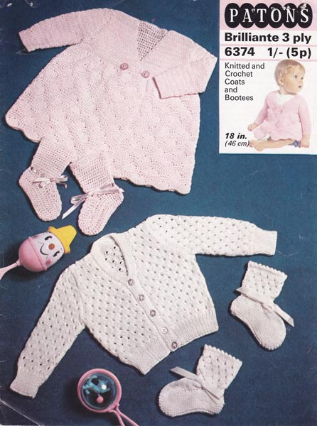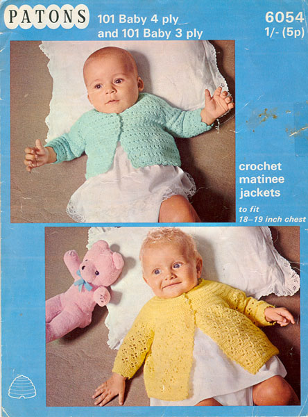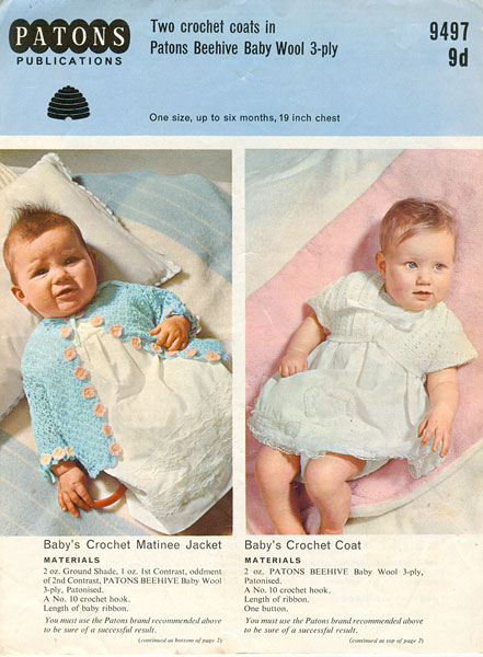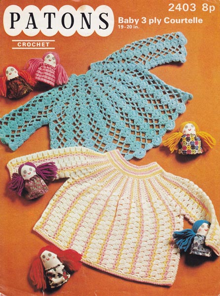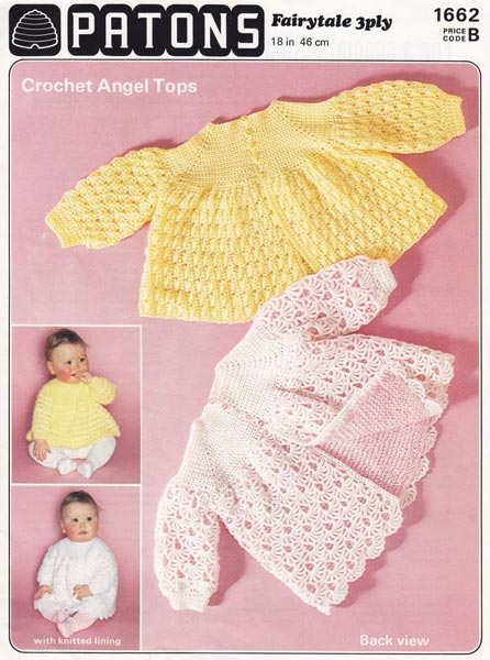 Patons 1662cr: Very pretty crochet pattern for baby matinee jackets or angel tops from 1979, one is lines with garter stitch knitted lining. Worked in modern 3ply for 18 inch chest. Work tension square before you start. Patern in great condition. colour All images and text on this website are copyright fab40s.co.uk and are for reference and historical interest only You can email sue@fab40s.co.uk