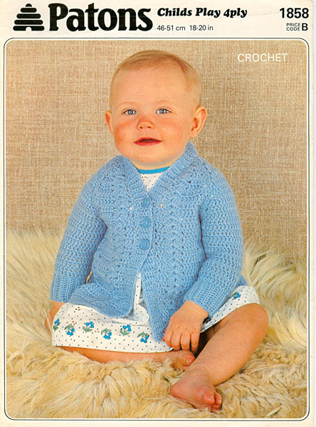 Patons 1858:Vintage crochet pattern for baby jacket in modern 4ply to fit 18-20" chest. Early 1980's Pattern is in great condition. original pattern as shown £2.00 colour All images and text on this website are copyright fab40s.co.uk and are for reference and historical interest only You can email sue@fab40s.co.uk |