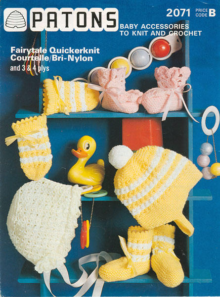 Patons 2071: Vintage knitting and crochet pattern for baby hats, bootees and mittens from the 1970's. Worked in 3ply, 4ply and quickerknit Pink bootees and the white bonnet are the crochet ones. Dont forget the tension square. original with some wear £2.00 colour All images and text on this website are copyright fab40s.co.uk and are for reference and historical interest only You can email sue@fab40s.co.uk