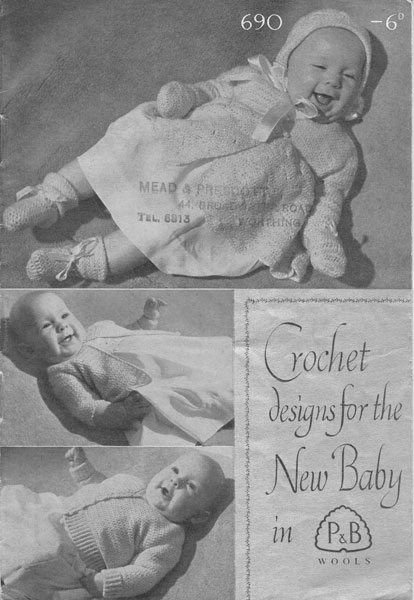 Patons 690: Fabulous CROCHET booklet from 1950's for the new baby. 2 matinee jackets, bonnet and bootees, to match, cardigan 18-20 inch chest. photocopy £2.50 pdf £1.99