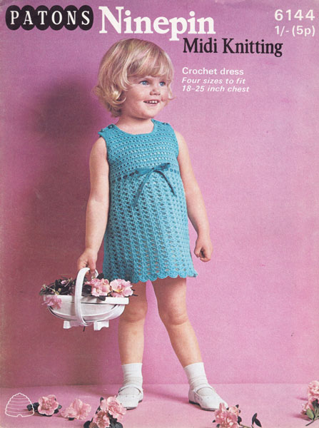 *Patons 6144: Great vintage little girls crochet dress pattern 1970. This little dress should fit 18-25 inch chest in 4 sizes. Worked in a 4ply yarn. Work a tension square and change hook if needed. The pattern says it is easy for a beginners. Pattern is in great condition.