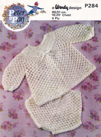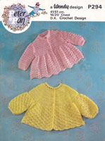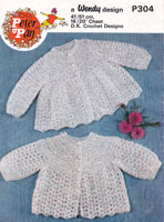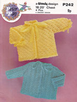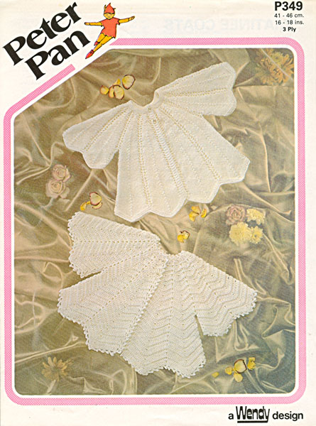 Peter Pan P349cr: Very pretty crochet pattern for baby matinee jackets to fit 16-18 inch chest ideal for prem or new born babies. Worked in 3ply so they are delicate and light, but warm. The one at the bottom is the crochet the other one is knitted. This is a reprint of an earlier pattern. Late 1970's