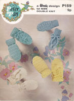 *Peter Pan P159: Great vintage baby crochet pattern for mittens 1970. This pattern has instructions for two pairs of crochet mittens and 2 pairs of knitted mittens to fit first size worked in double knitting. Pattern is in good condition.