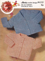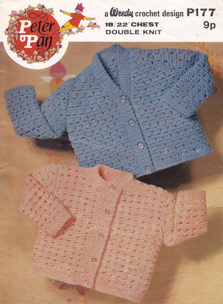 *Peter Pan P177: Great vintage baby crochet pattern for cardigans 1970s. This useful pattern has two styles of cardigan, one with a V neck and the othr pbutton up, both are worked in double knitting yarn to fit 18 and 20 inch chest for the blue design and 20 and 22 for the peach design. Always work tension square and change hook if needed. Pattern is in good used condition.