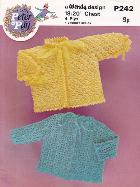*Peter Pan P242: Great vintage baby crochet pattern for two matinee jacket s 1970s. Both very pretty and with ribbon at neck, but this can be replaced with a button if you prefer, just make the neck a little smaller when working the neck edging. To fit 18 and 20 inch chest and worked in 4ply yarn. Always work a tension square and change hook if needed. Balls were probably 20g, but work on the thought that they were 1oz (30g) and you will have more than enough. Pattern in very good condition.