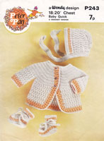 *Peter Pan P243:Pretty vintage crochet pattern for baby set 1970. This pattern is in two colours and will fit 18 and 20 inch chest. There are instructions for the bonnet, jacket and bootees worked in baby QK, so try double knitting and 4ply in a tension square to see which is best for your tension as this ply fell between the two modern ones. .Always work a tension square and change hook if needed. Pattern in good used condition.