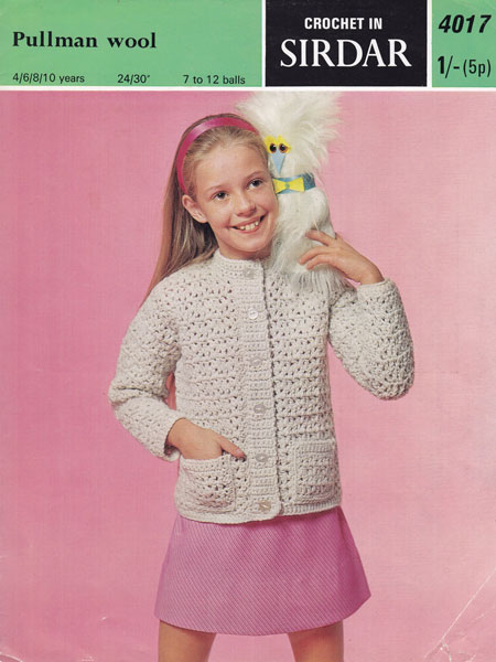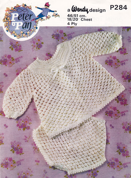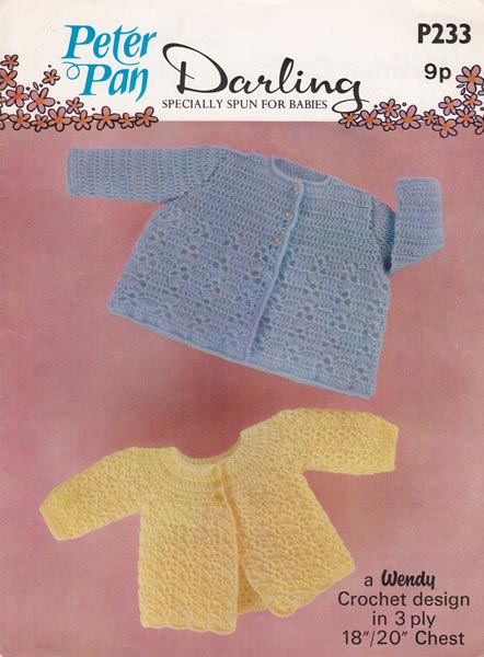 Peter Pan P233cr: Pretty vintage knitting pattern from the 1970's worked in vintage 3ply to fit 18-20inch chest, work tension square to see if hook change is needed. Light and warm for the summer days. Pattern in good condition.