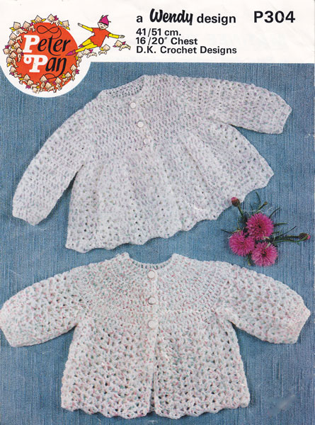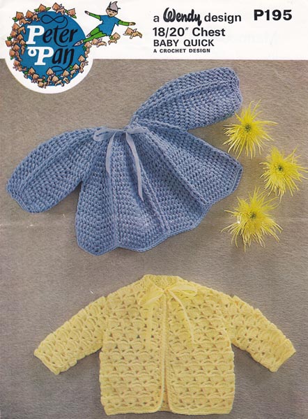 Peter Pan P195cr: Great vintage crochet pattern for two matinee jackets in simple designs from late 1970's, very pretty, very retro. To fit 18, 20 inch chest in baby quick knit which was similar to baby double knitting, work a tension square and see if you need to change hook size. Pattern in good condition, slight bend to centre clean and sound.