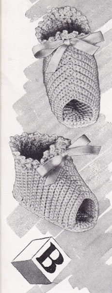 Star 135: Baby Booties: Great booties with little dolls as ornaments. Simple but cute from late 1940s. More baby bootees coming! Including pattern above.