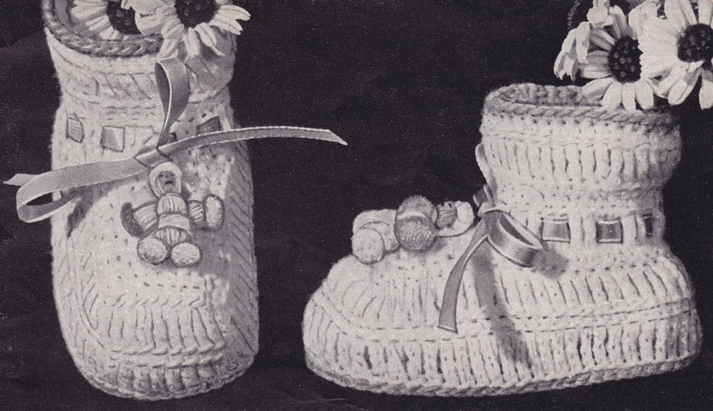 Star 15: Toeless Bootees: Another great idea for tiny toes this Christmas - a retro pair of slippers from 1941 in crochet. Easy to work. Also included in this pattern another pair of baby bootees with little dolly as decoration, see below.