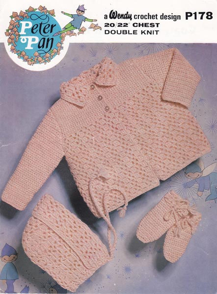 Peter Pan P178: Pretty vintage crochet pattern for jacket, mitts and bonnet in lovely crochet design. To fit 20-22 inch chest and worked in double knitting, so quick to work. 1970's Pattern in good condition, slight split at bottom of spine otherwise clean and sound.
