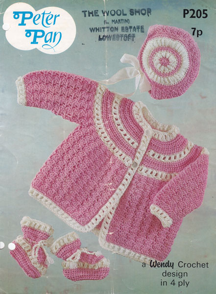 Peter Pan P205cr: Very pretty bonnet, jacket and bootees set from 1970 in a very pretty stitch. To fit 18" and 20" chest worked in 4ply, work a tension square to see if you need to change needles to get correct tension. Balls are probably 25g although it does not say. Pattern is well used with punch holes to spine, picture strip in tact, crease down front.