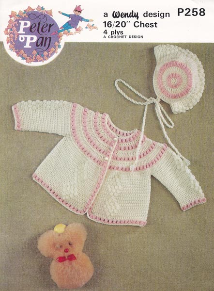 Peter Pan P258cr: Pretty vintage crochet pattern for jacket and bonnet influenced by USA designs from the 40's and 50's. This pattern is from the late 1970's worked in 4ply and is in a good condition. To fit 16, 18 and 20 inch chest. Lovely for a christening or use angora for the coloured parts, very pretty.