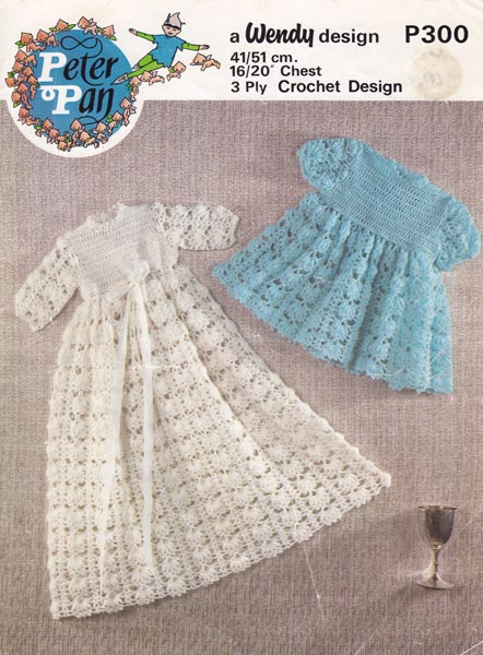 Peter Pan P306cr: Pretty crochet dress, this vintage crochet pattern is from the late 1970s worked in double knitting to fit 20" chest. Pretty yoke, try silk under skirt to give that touch of glamour.