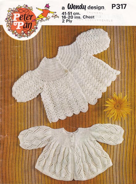 Peter Pan P317cr: Pretty vintage pattern for CROCHET and knitting jackets from late 1970's possibly early 1980's to fit 16, 18, 20 inch chest. Ideal for today's tiny newborns or older babies. Very pretty for christenings and party wear. Pattern is in good condition apart from several very tiny biro marks near some numbers on first page.