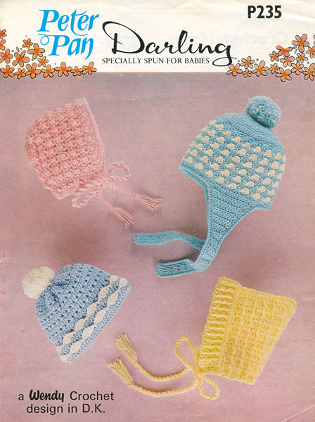 Peter Pan P235cr: pretty vintage pattern with 4 different designs to fit 9 months to 2 years. late 1970's All crochet in double knitting. In very good condition