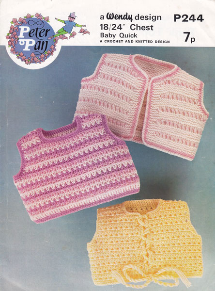 Peter Pan P244: Great baby knitting and crochet pattern waistcoat tank top 1970. This pattern has instructions for 2 crochet tops, one of which is waistcoat the other a tank top or slipover, the top design is knitted. All are worked in baby quick knit or try baby double knitting for a slightly larger size or 4ply for a slightly smaller size. to fit chest 18-24 inches. Pattern is in good condition.