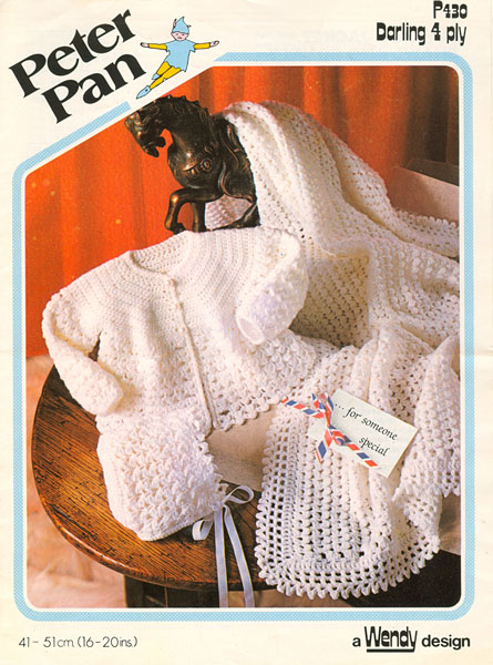 Peter Pan P430cr: Vintage crochet pattern for matinee and bonnet and shawl in 4ply to fit 16"-20" chest ideal for new born. Late 1970's