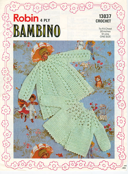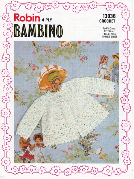 Robin 13036: Pretty vintage crochet matinee jacket pattern from late 1970's, easy to work in 4ply, try a tension square to make sure the hook size is correct for size required. To fit 17-19 inch chest. Pattern is in good condition.