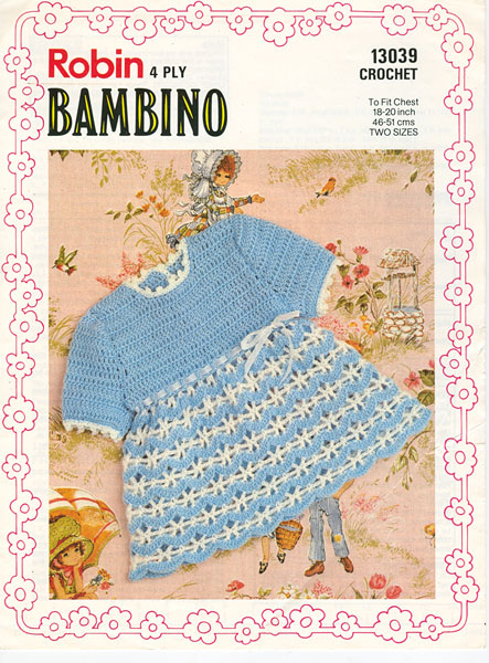 Robin 13039: Vintage crochet pattern for a pretty baby dress in modern 4ply to fit 18-20 inch chest late 1970's