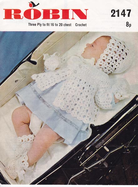 Robin 2147: Lovely vintage crochet pattern for sweet little set comprising of jacket, bonnet, bootees and mittens. Delicate, light and warm for chilly summer days. worked in vintage 3ply so try hook and see if you need to change size, always work a tension square. To fit 16-20 inch chest, in 3 sizes. Pattern is a little worn, but clean and sound.