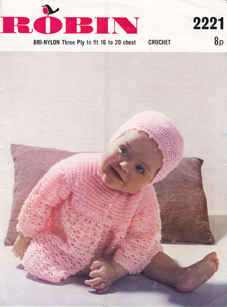Robin 2221: Great vintage crochet pattern baby matinee coat set 1970s. This pattern is in vintage 3ply so work a tension block first to see if you need to work in modern 4ply to get a better size as vintage 3ply was a bit thicker than modern yarns. To fit 16-20 inch chest, so ideal for tiny baby. Pattern is in good condition.