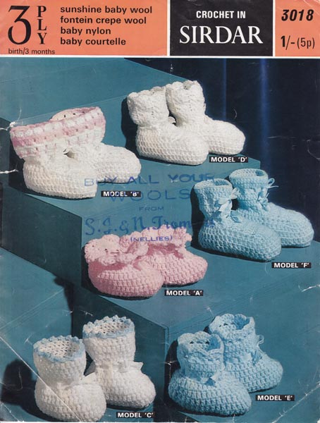 Sirdar 3018: Pretty selection of bootees in crochet from 1970. This is the older version of Sirdar 3175 below - but they have the same instructions and illustrations. There are 6 different designs all easy and quick to make, great gift for new baby or christening with silk ribbons worked in 3ply. Crochet instructions given on back - so ideal for a beginner. Pattern is worn with several creases as shown, small nicks to spine and edges.