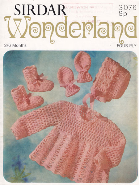 Sirdar 3076: Great vintage crochet pattern babies dress bonnet set 1970s. This is a lovely pattern with instructions for the dress, (angel top) bonnet, bootees and mittens - the dress could easily be made into a matinee jacket. Worked in 4ply. Always work a tension square before starting. Pattern is nice used condition, with trade stamp to front.