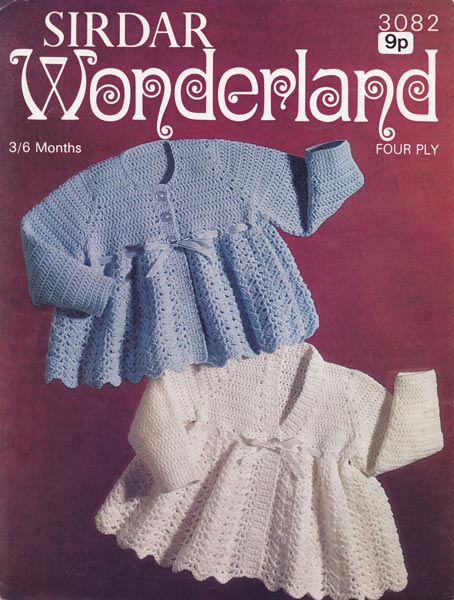 Sirdar 3082: Vintage Crochet pattern. Pretty traditional matinee jackets from 1970's to fit 3-6 months (19-20 inch chest) so sweet, great for christening gift or party wear to keep the spring chill at bay. Pattern in great condition.