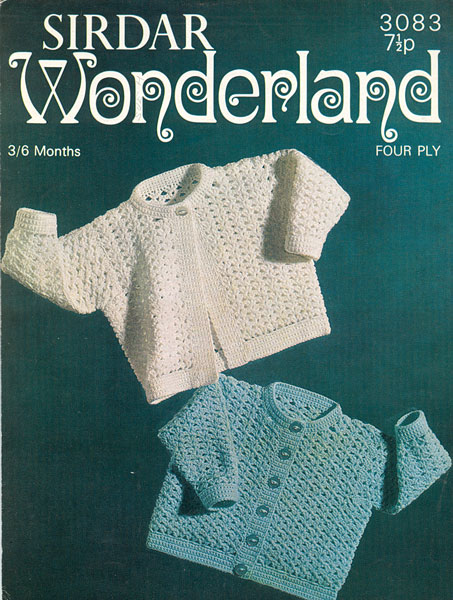 Sirdar 3083: Vintage baby jackets in crochet to fit 3-6 months in four ply, always work a tension square. 1970 Good condition, clean and sound.